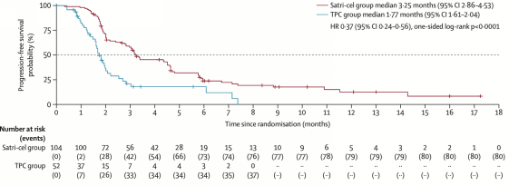 值得注意的是,TPC组20例接受satri-cel输注受试者的mOS达到9.20个月。satri-cel组和TPC组中所有接受satri-cel输注受试者(n=108)的mOS为9.17个月。